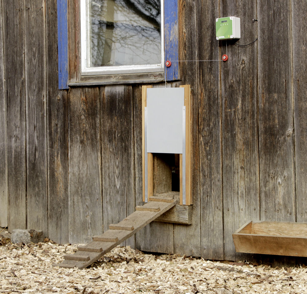 Door de automatische kippendeur kunnen de kleppen, deuren of schuiven in pluimveestallen automatisch geopend en gesloten worden.
