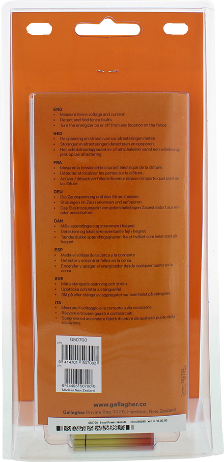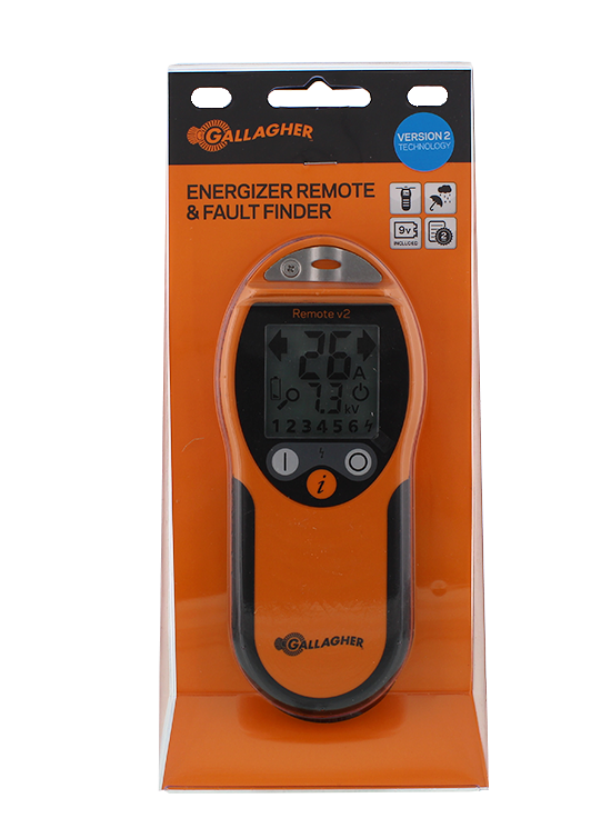 Afstandsbediening om het schrikdraadapparaat aan/uit te zetten overal langs de afrastering. Geïntegreerde ‘vind fouten’-functies leiden u naar het probleem in de afrastering. ‘Onderzoek’-functie toont het display van het schrikdraadapparaat op de afstandbediening. Werkt alleen i.c.m. M1800i. M2800i en M5000i. 0