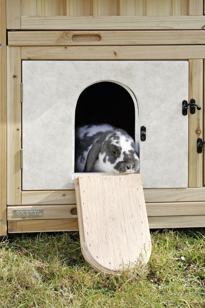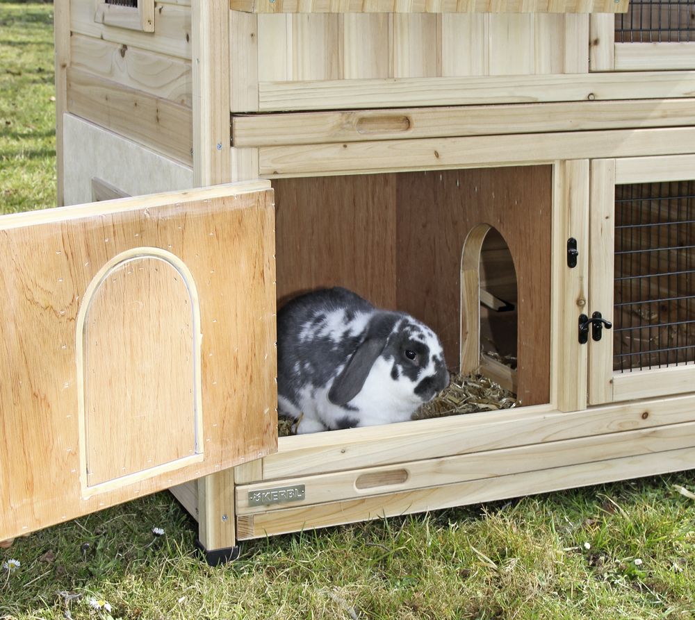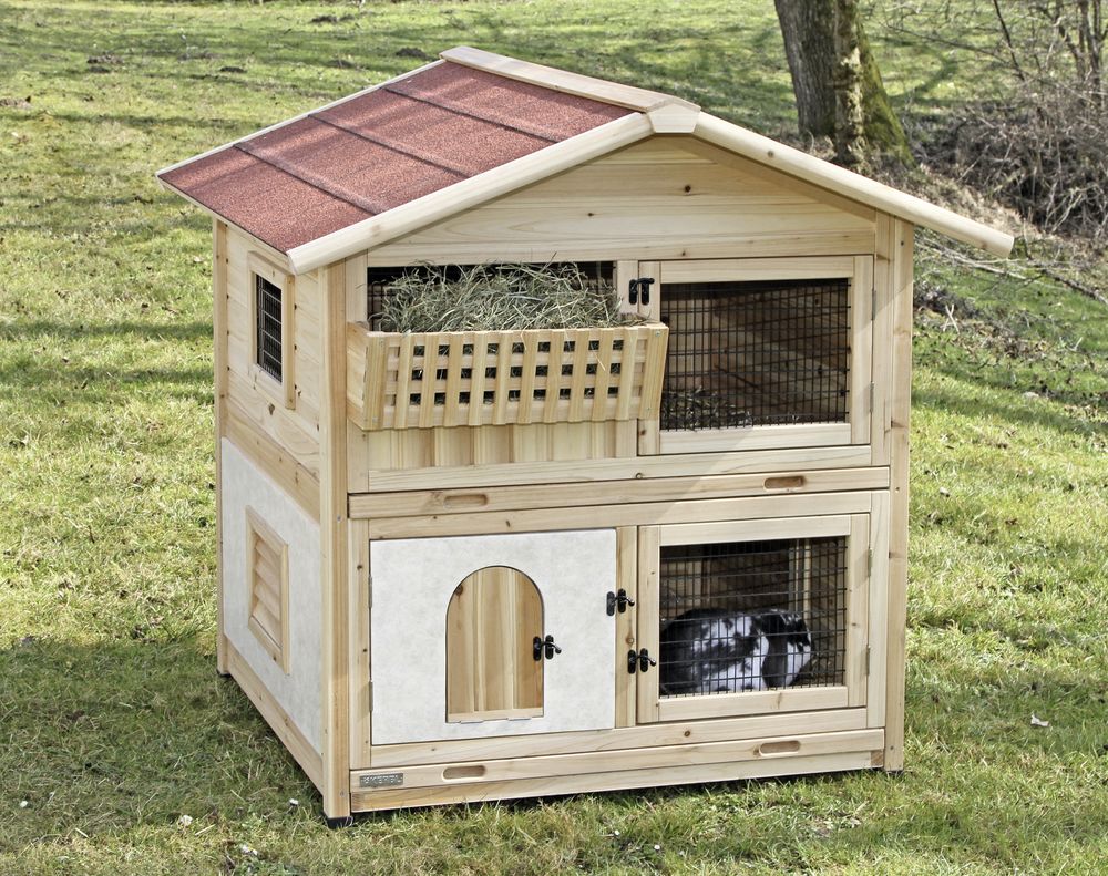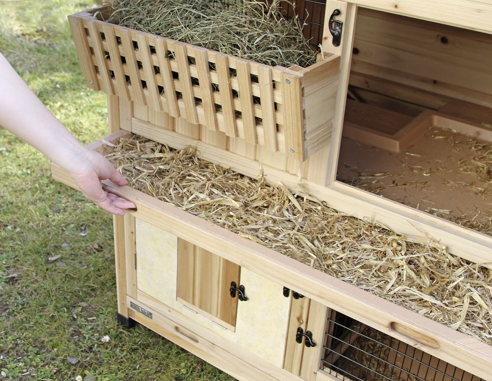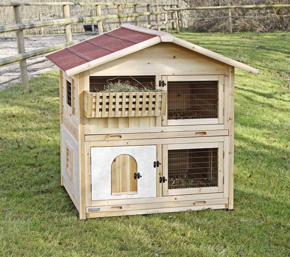 Het geïsoleerde slaapgedeelte (dubbele wanden met binnenbekleding van piepschuim) op de begane grond beschermt knaagdieren tegen kou in de winter en warmte in de zomer. Met de schuifdeur kan het slaapgedeelte worden afgesloten. De bovenverdieping is toegankelijk via geïntegreerd klimhulpmiddel en het balkon kan gebruikt worden als hooiruif. Om het schoonmaken makkelijker te maken zijn de kunststof bakken uitneembaar. Het knaagdierhuis is eenvoudig te monteren met het plug-in systeem.