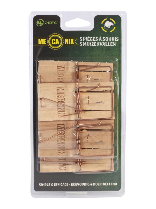 Doeltreffende houten muizenvallen gemaakt van PEFC GECERTIFICEERD hout.Voor gebruik binnen en buiten rond gebouwen.