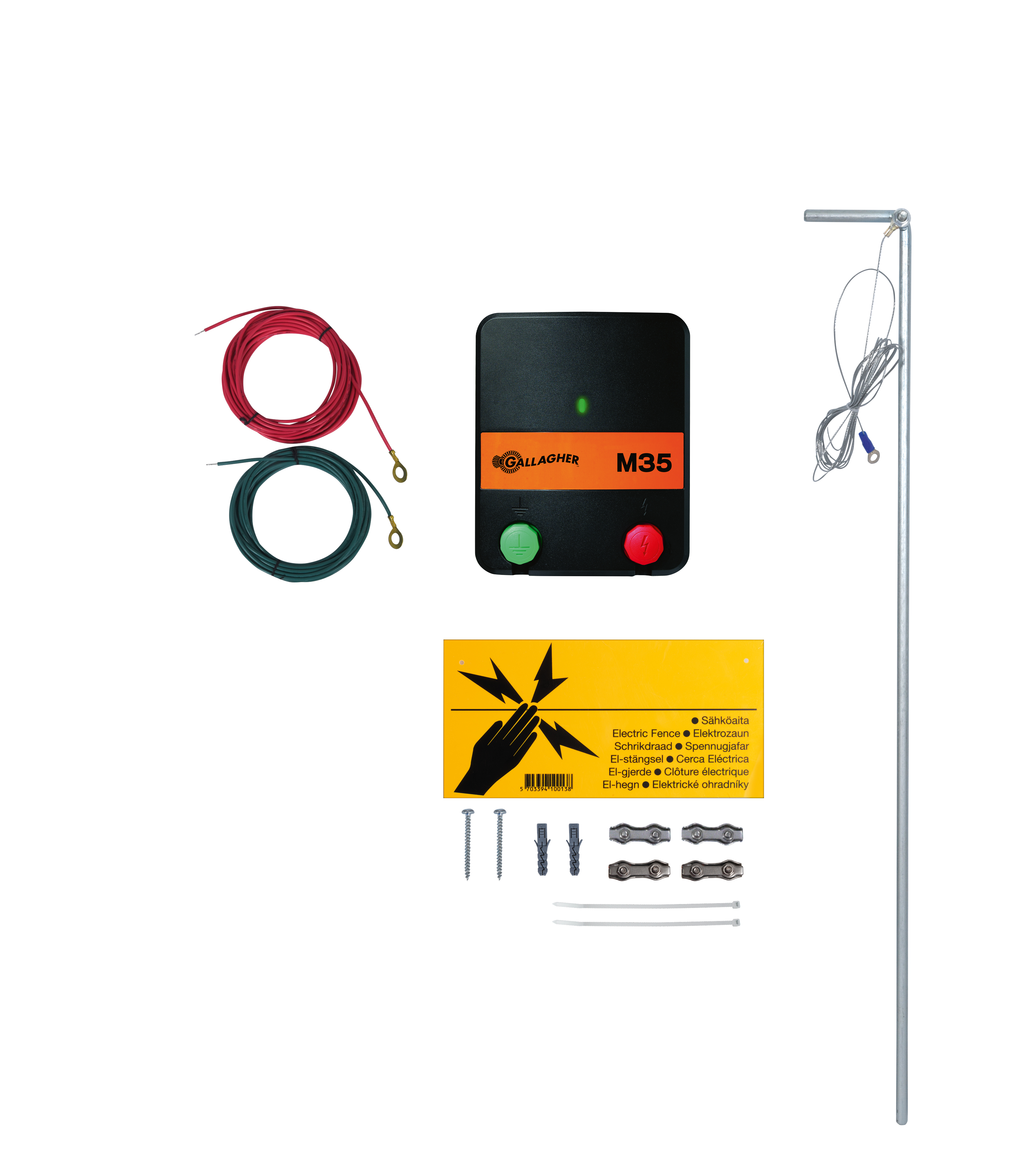 De ideale basisset voor een effectieve afrastering voor (huisdier)toepassingen rondom uw huis en in uw tuin. De starterkit bevat de belangrijkste onderdelen voor een elektrische afrastering tegen bijvoorbeeld honden en katten in uw tuin en bloemperken, het beschermen van uw volières tegen katten of het weren van kleine (roof)dieren. Deze set bestaat uit: M35 (schrikdraadapparaat), 4 draadverbinders, 1 aansluit set, 1 aardpen, 1 waarschuwingsbordje (incl. bevestigingsmateriaal), 1 montageset en een handleiding