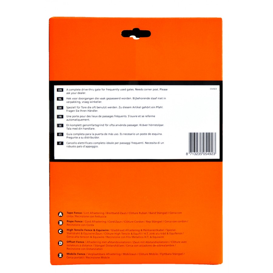 Een compleet hek. eenvoudig mee te nemen en op te hangen op plaatsen waar u vaak door een hek moet rijden. De trekker duwt het hek. dat onder spanning staat. zelf open en het sluit automatisch. Paard