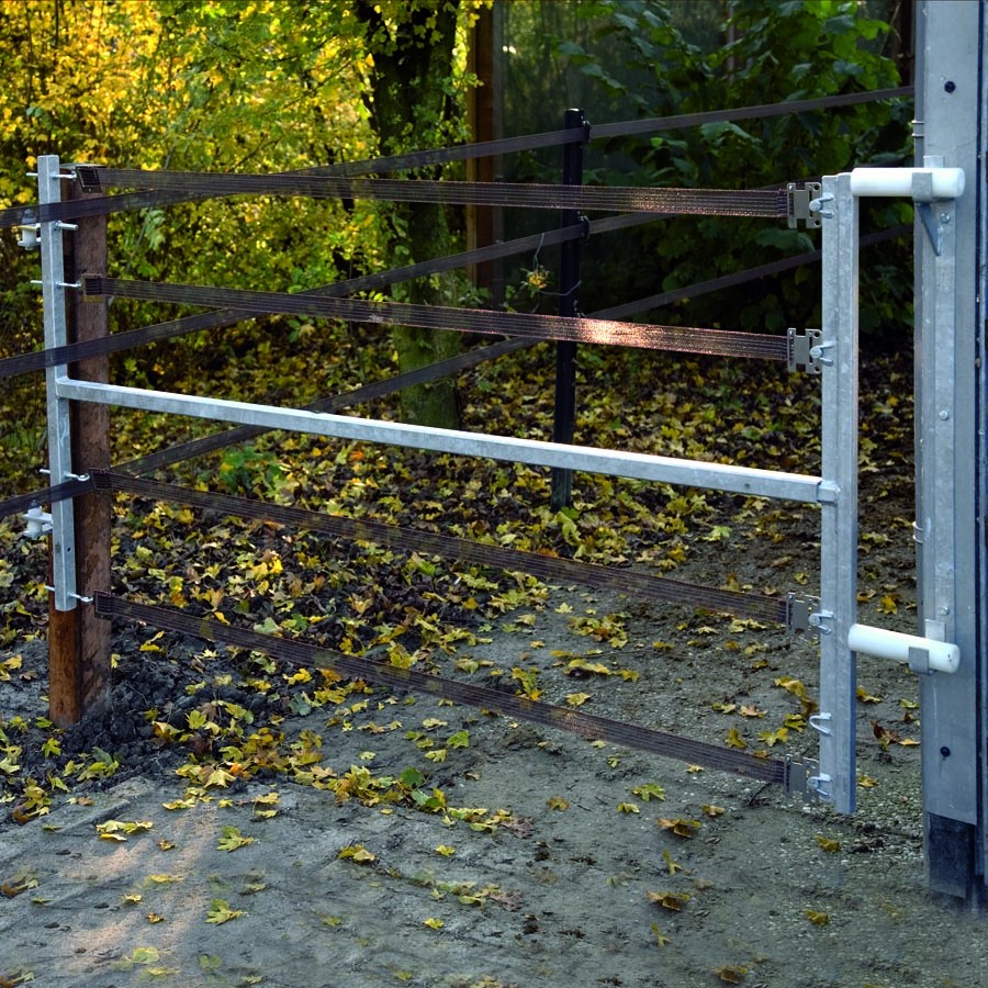 Zeer doeltreffend. onderhoudsvrij en verstelbaar elektrisch hek. Gegarandeerde lange levensduur. Geschikt voor al uw permanente elektrische afrasteringen. Geleverd zonder gegalvaniseerde draden. U kunt naar wens ook lint in het hek spannen. Afmeting: 2.5m breed x 1m hoog. tot max. 4.5m uit te schuiven. Paard