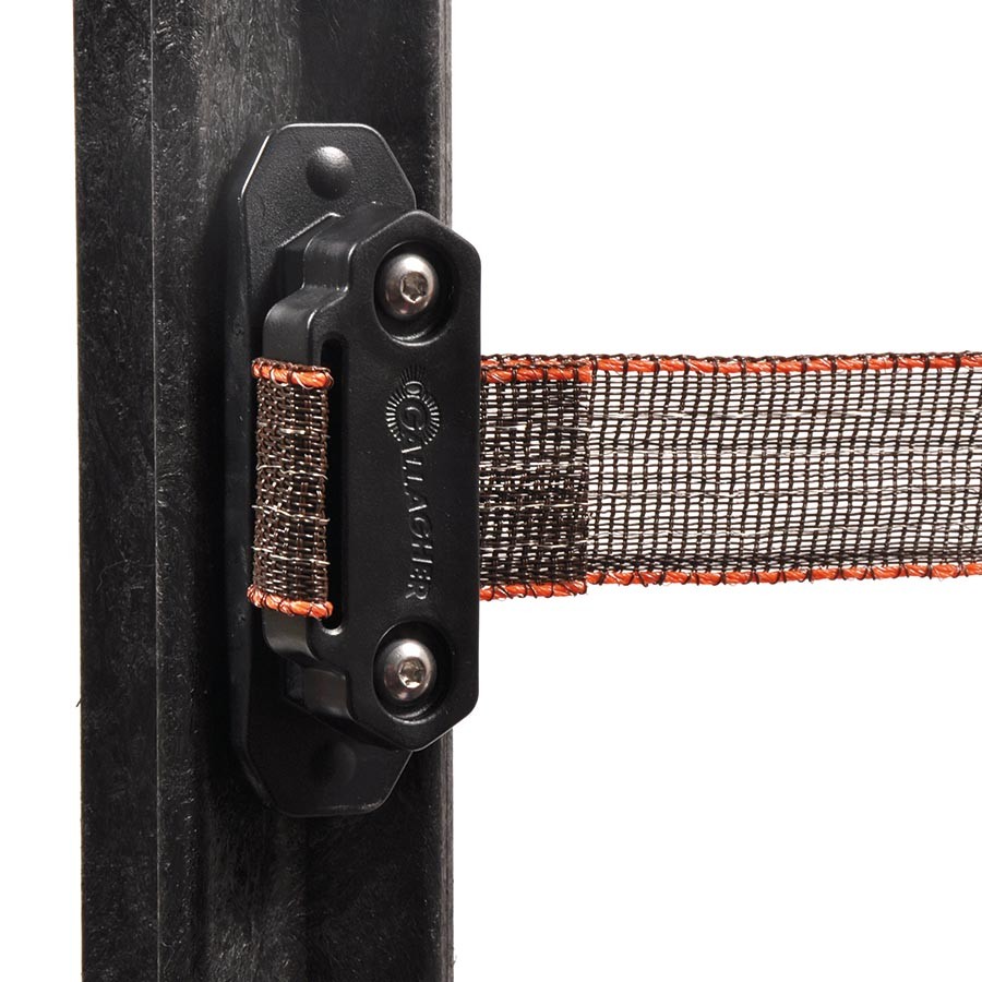 Deze innovatieve en robuuste hoekisolator heeft talloze voordelen ten opzichte van de traditionele lint-isolatoren zoals: Een uniek subframe voor optimale stevigheid en bevestiging aan de paal. Meegegoten rubbers voor optimale grip op het lint. Te bevestigen met 1 maat schroefbit. Unieke lip voor het spannen en herspannen van het lint. Het apart verkrijgbaar tussenplaatje (art.nr. 708027) is te gebruiken als verbinder en poortgreepanker. Paard