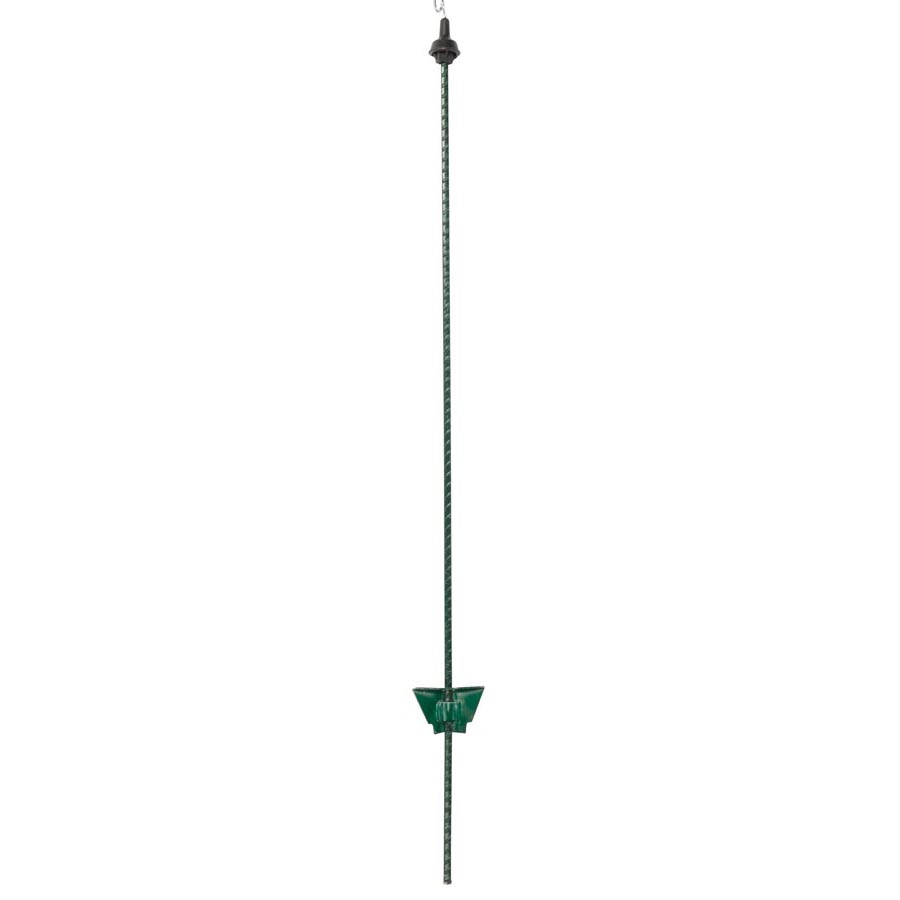 Groene duurzame veerstalen paal 1.05m met krulisolator voor draad. koord en lint tot 10mm. Paal heeft een dubbele intrap. 0